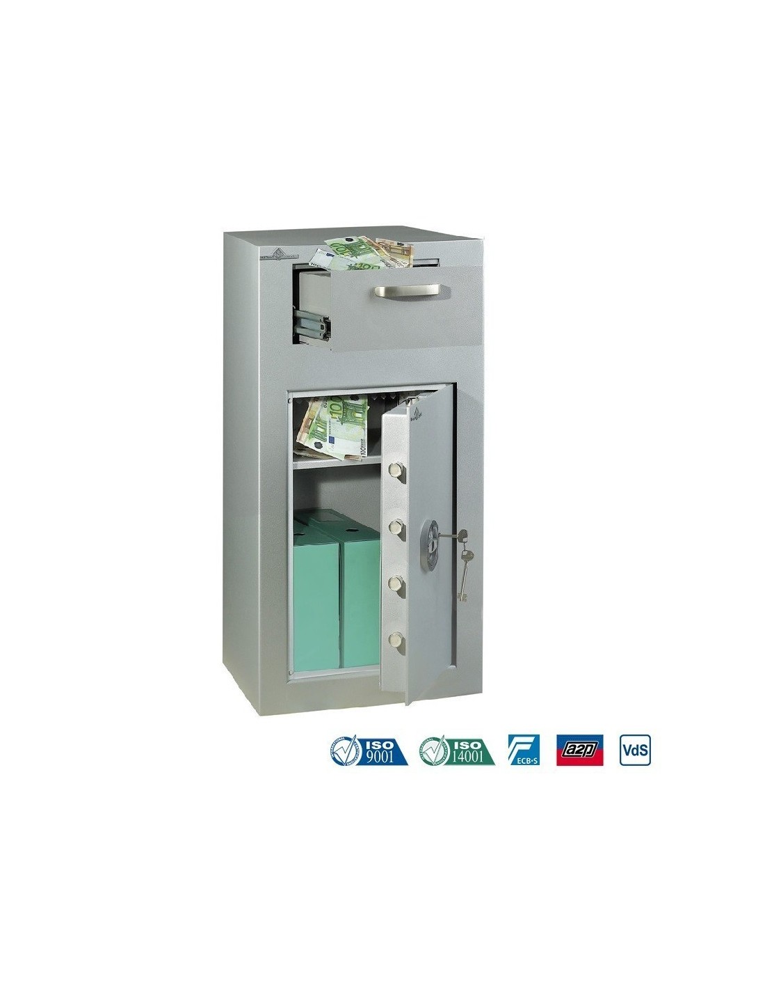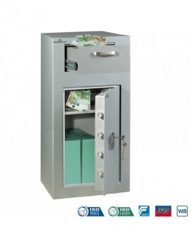 En effet ,le modèle , Hartmann l’a soumis aux règles de la norme Allemande VDMA niveau B. Cet équipement robuste construit en acier 1er choix avec parois défensives de forte épaisseur qui sont capables de résister au feu et aux attaques par effraction grâce à sa porte.