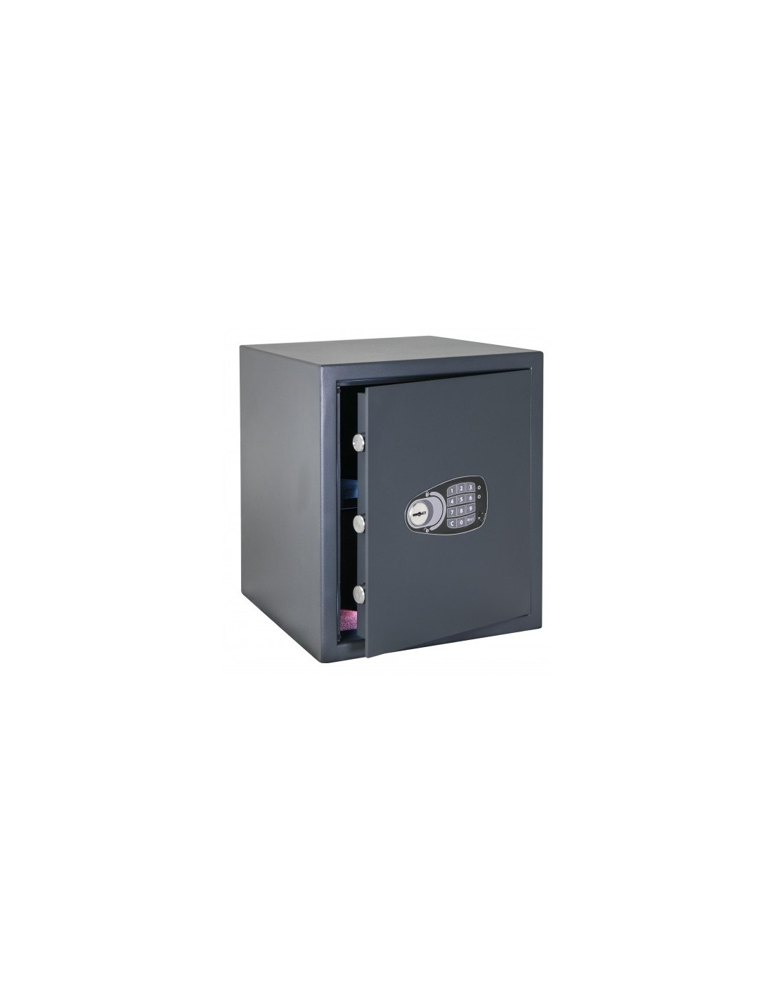 Caractéristiques techniques: Epaisseur des parois 2 mm Epaisseur de la porte 45 mm dont 6 mm de façade Verrouillage de sécurité d'urgence Eclairage par 2 leds de faible puissance à l’ouverture Coloris gris graphite Serrure à clefs et Serrure électronique: Un code en utilisant chiffres 2-15 Un code d'urgence 8 chiffres Retard programmable de 1-99 min. Piles incluses. Avertissement de pile faible.