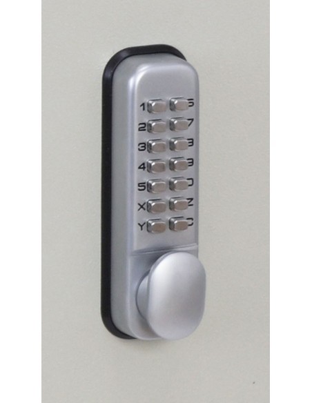 - VERROUILLAGE: Un verrou à code combiné à bouton-poussoir mécanique est disponible sur toutes les unités de taille. La serrure a plus de 8 000 combinaisons différentes et est livrée avec une opération de fermeture à poussoir. La serrure dispose également d'une fonction de maintien en attente pour une entrée sans code.