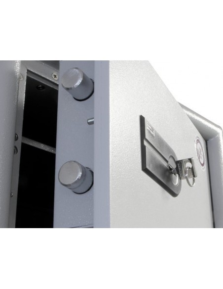 Ce modèle de coffre-fort Combi-Line dispose d’une serrure blindée à double panneton et est livré en série avec deux clés. Elle est contrôlée par le VdS (catégorie 1) et homologuée selon la norme européenne EN 1300 par l’ECB•S (catégorie A). 9 gâchettes et 1 million de combinaisons différentes garantissent une sécurité optimale. Votre avantage : avec une clé classique en main, vous êtes le seul à avoir le contrôle de l’accès à vos biens de valeurs. Tenez compte du fait qu’il arrive qu’une clé soit dérobée ou perdue dans d’autres circonstances, et rangez-la par conséquent en lieu sûr.