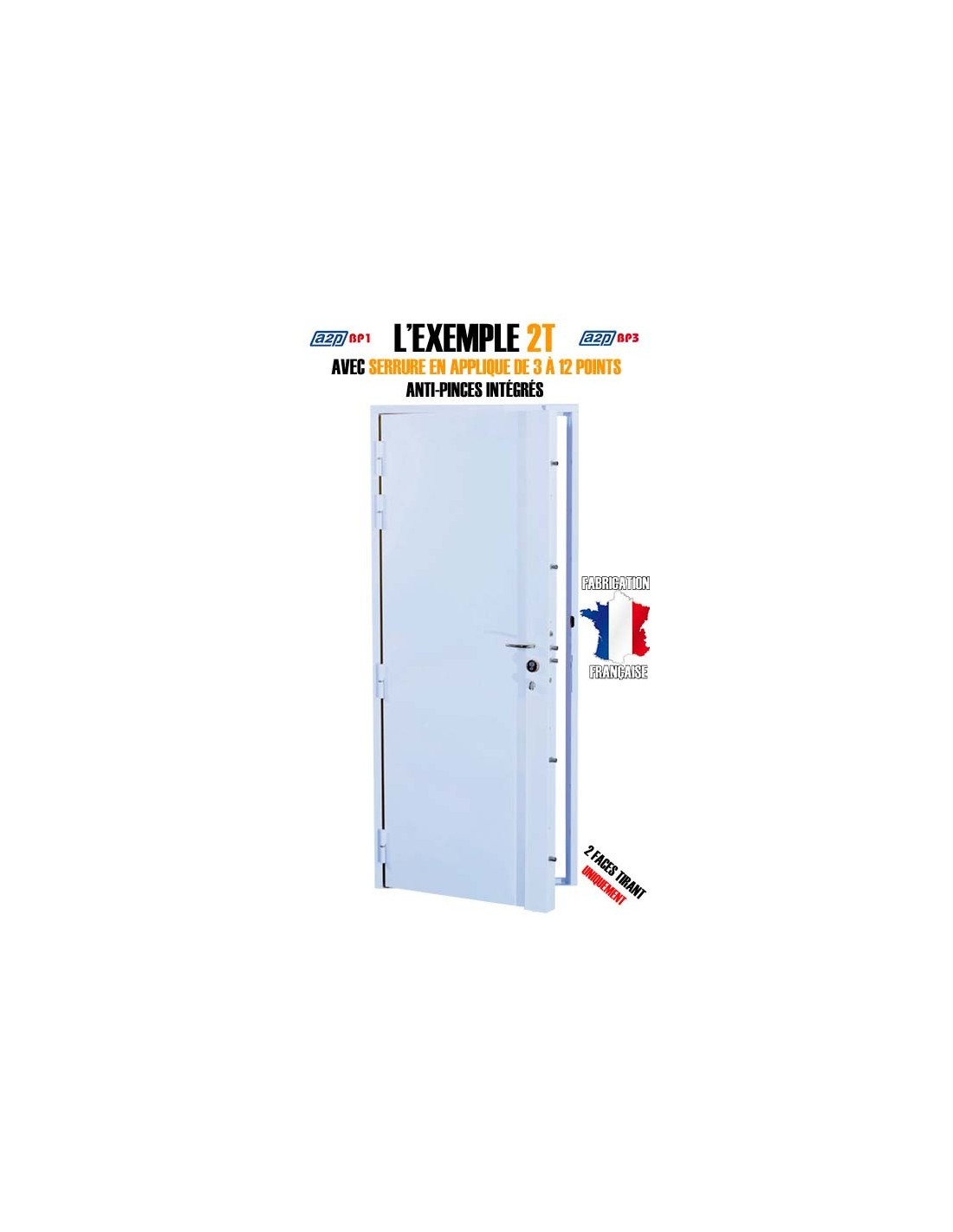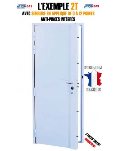 L'EXEMPLE 2T est un bloc-porte blindé doté d'une serrure carénée en applique et de deux faces blindées en acier.