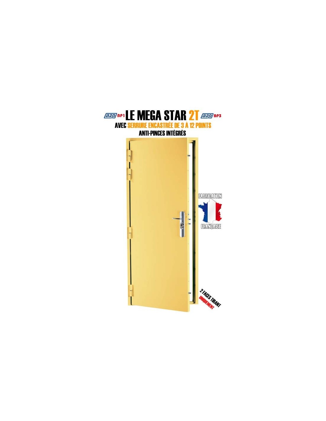 LE MEGA STAR 2T est un bloc-porte blindé doté d'une serrure carénée encastrée et de deux faces blindées en acier.