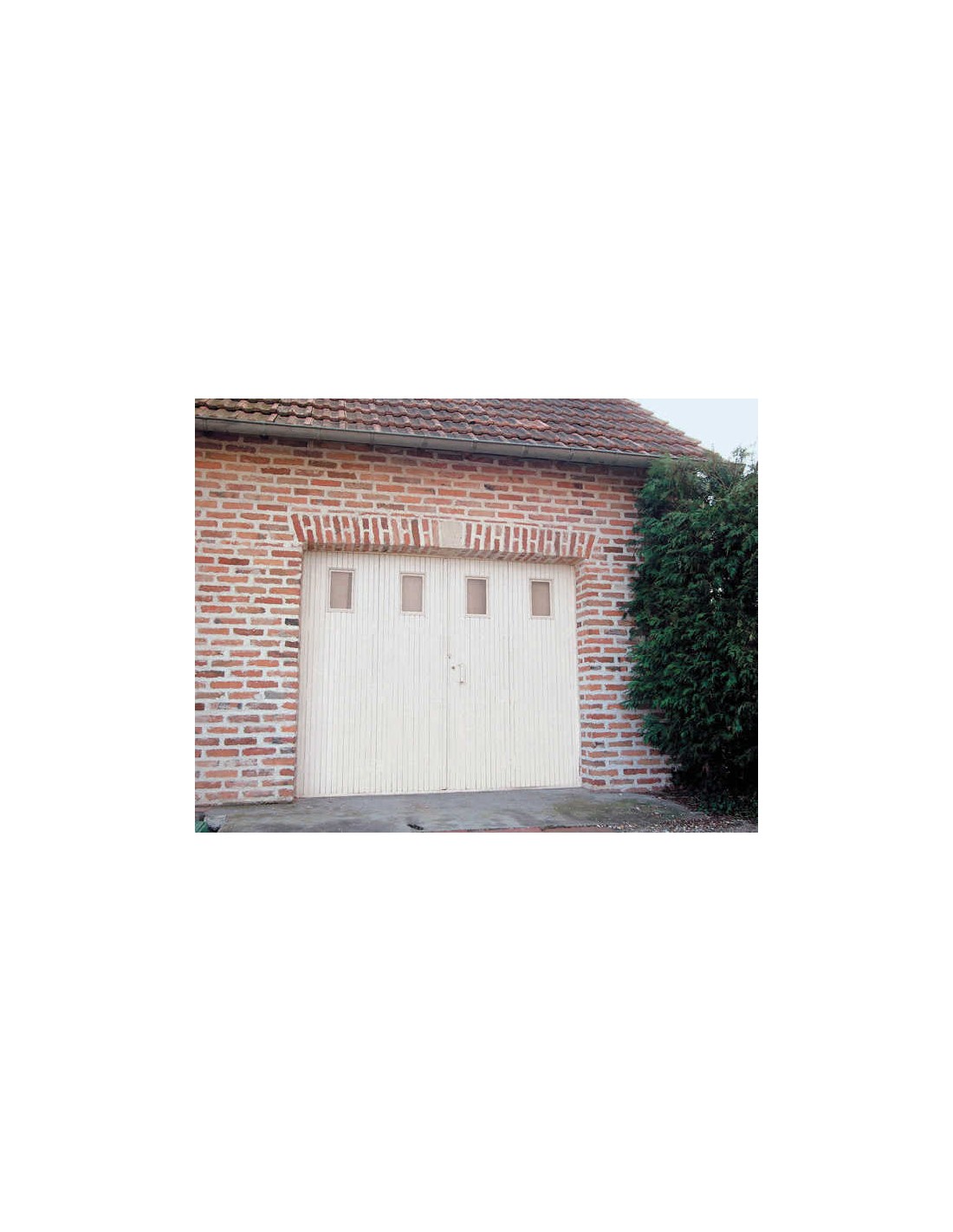 Tablier composé de lames bois verticales, assemblées par des broches métalliques. Les deux panneaux centraux s'ouvrent pour une entrée piétonne.